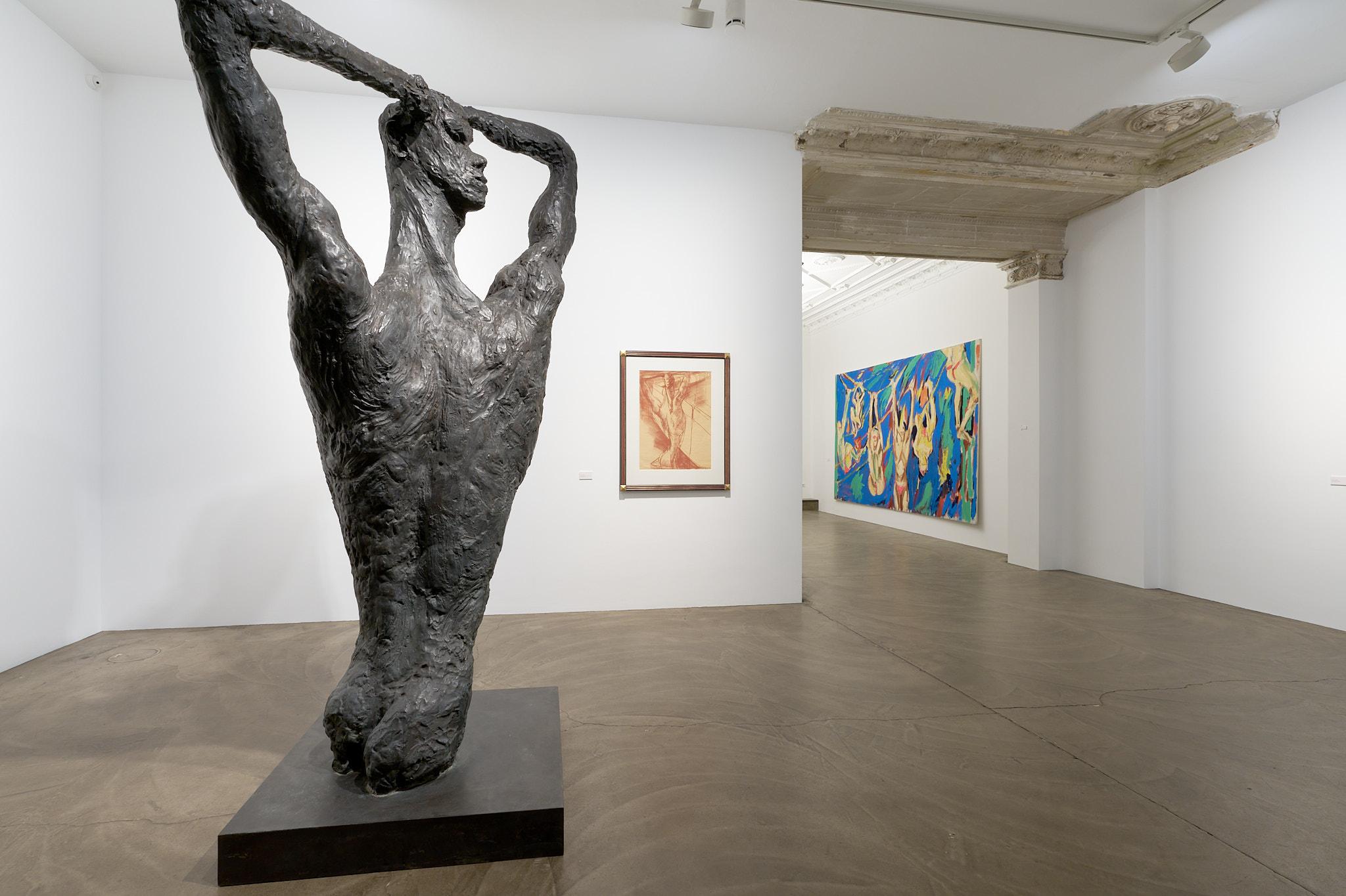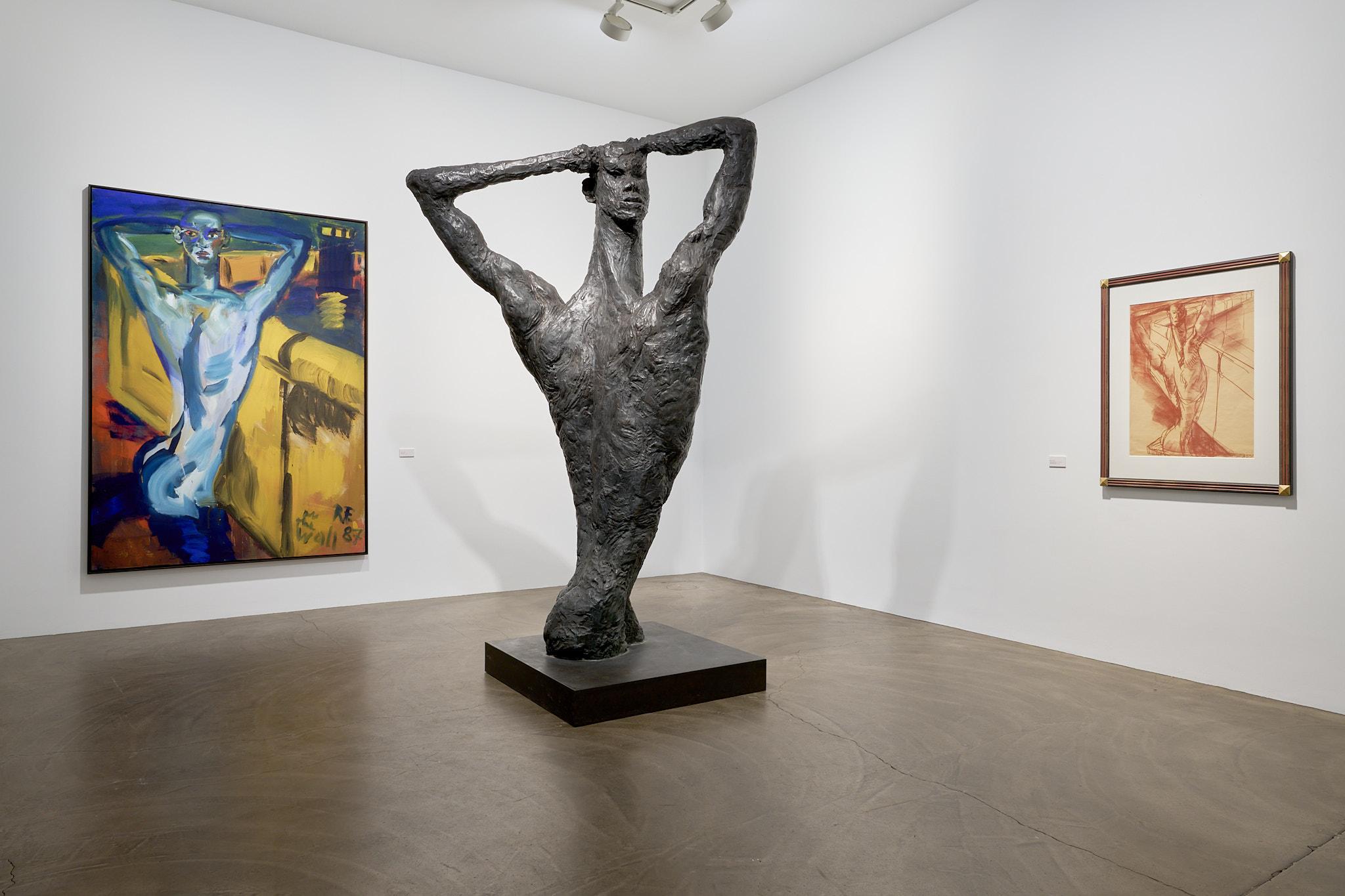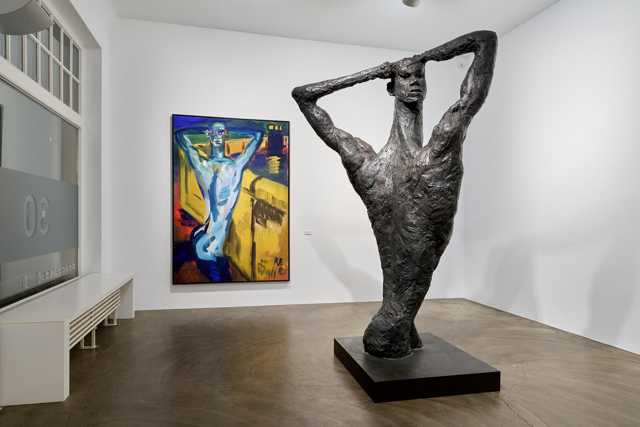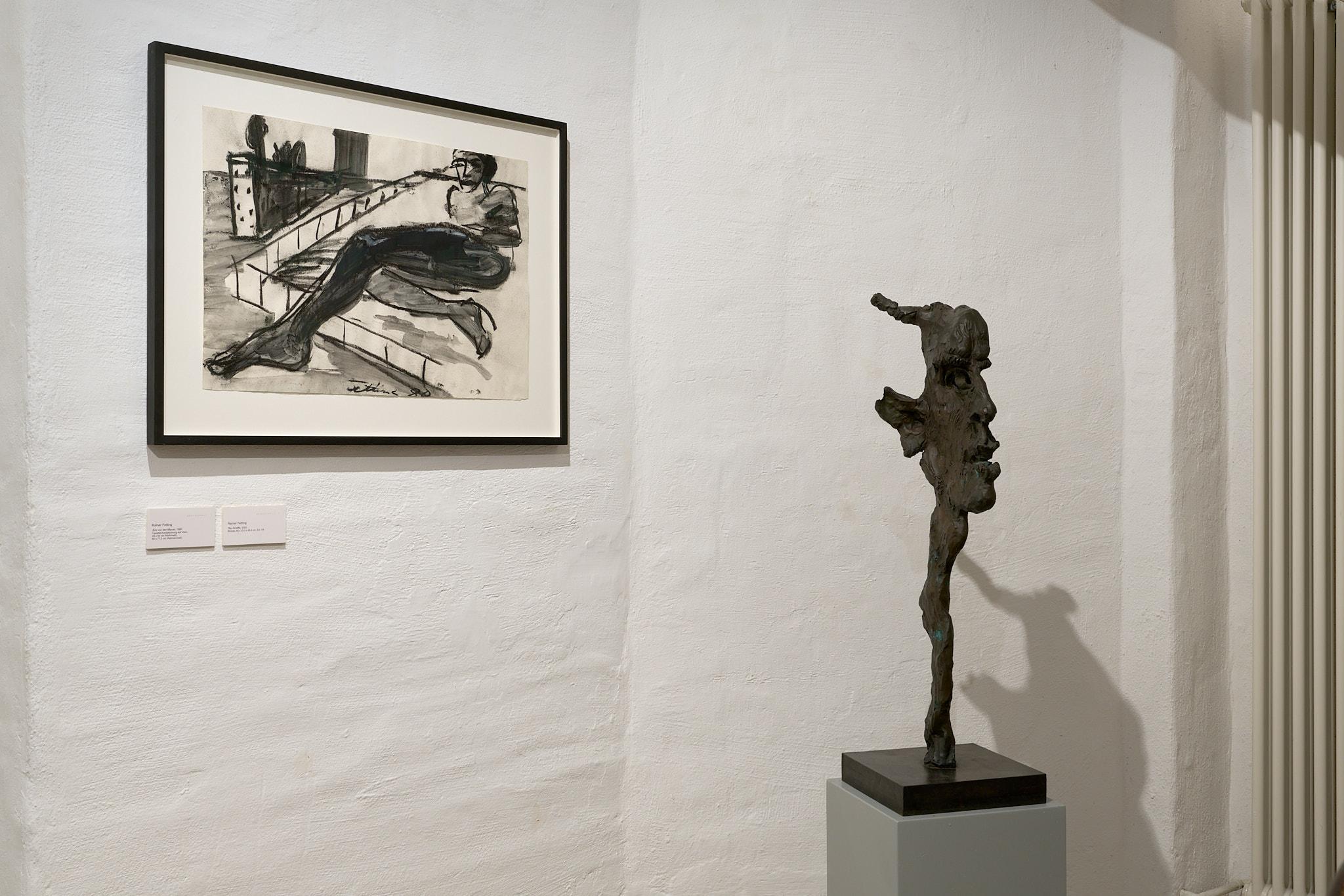 Ein besonderes Highlight der Ausstellung bildet Fettings Skulptur „Die Drehung“von 1987 in Zusammenschau mit seinemausgestellten Gemälde „The Wall“ aus dem gleichen Jahr und einer Rötelzeichnung als Vorstudie sowohl zum Gemälde als auch zur Skulptur. Der expressionistisch übersteigerte, langgestreckte Torso in Körperspirale mit angewinkelten Armen und auf den Kopf gelegten Händen der überlebensgroßen Bronzeskulptur erscheint im Gemälde in Blautönen vor einer gelb gehaltenen Darstellung der Berliner Mauer.Die Zusammenstellung zeigt einerseits die enge Verbindung von Malerei, Zeichnung und Plastik in Fettings Schaffen. Die drei Arbeiten lassen den Körper in unterschiedlichen Dimensionen erfahrbar werden: als farbige Fläche, als Linie, als Bewegung im Raum. Sie verkörpern zugleich den Kern des künstlerischen Ansatzes der „Jungen Wilden“ – das Unmittelbare, das Gestische, das Lebendige. In seiner Darstellung des männlichen Aktes vor der Mauer verweist Fetting aber auch symbolisch auf die Verbindung von Kunst, Körperlichkeit und Zeitgeschichte, auf das West-Berlin der 1980er Jahre als einen Freiraum für künstlerischen Ausdruck und sexuelle Selbstbestimmung im Schatten mentaler und realer Mauern.