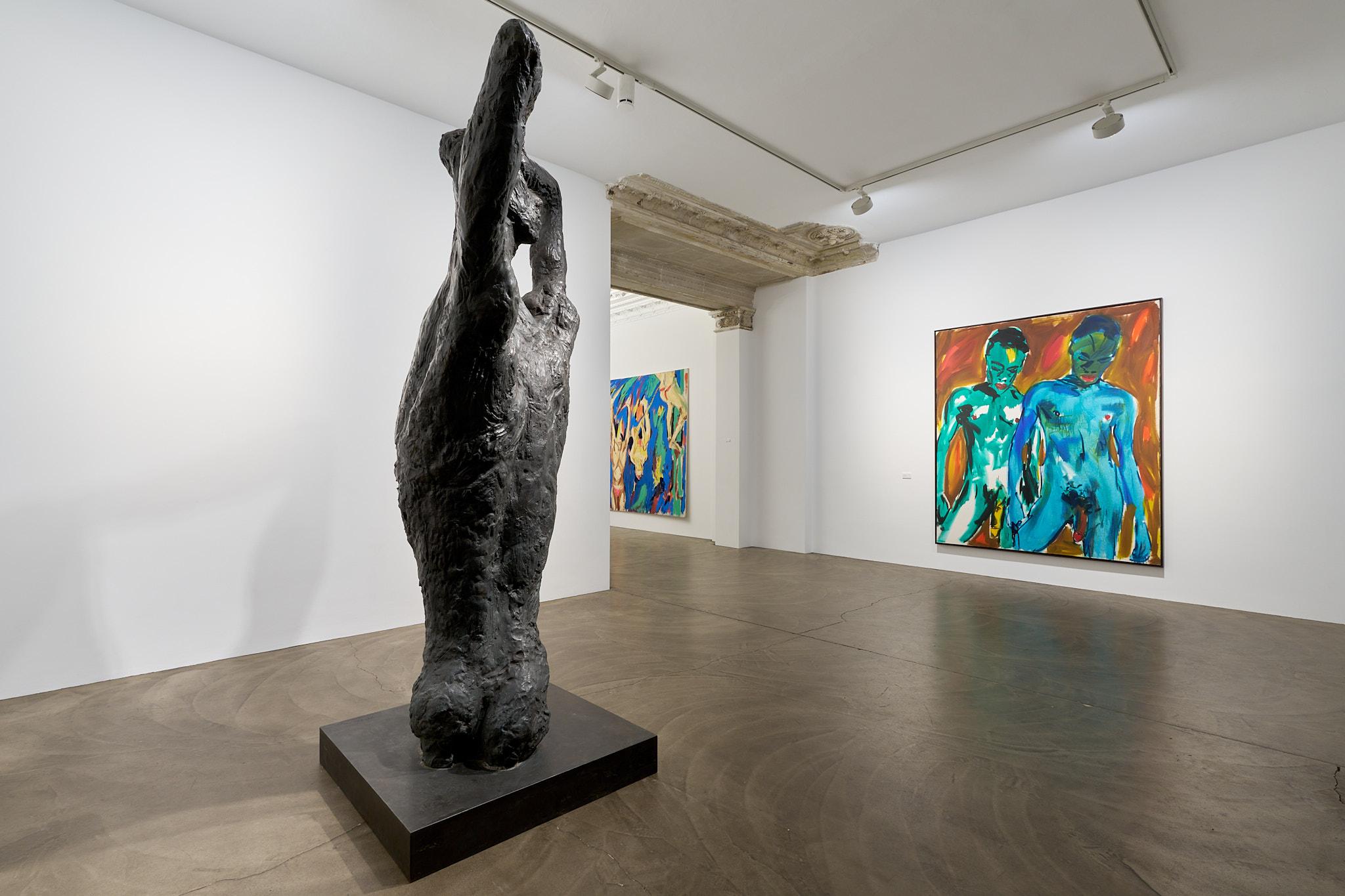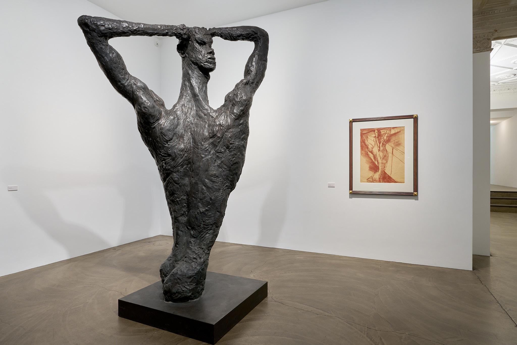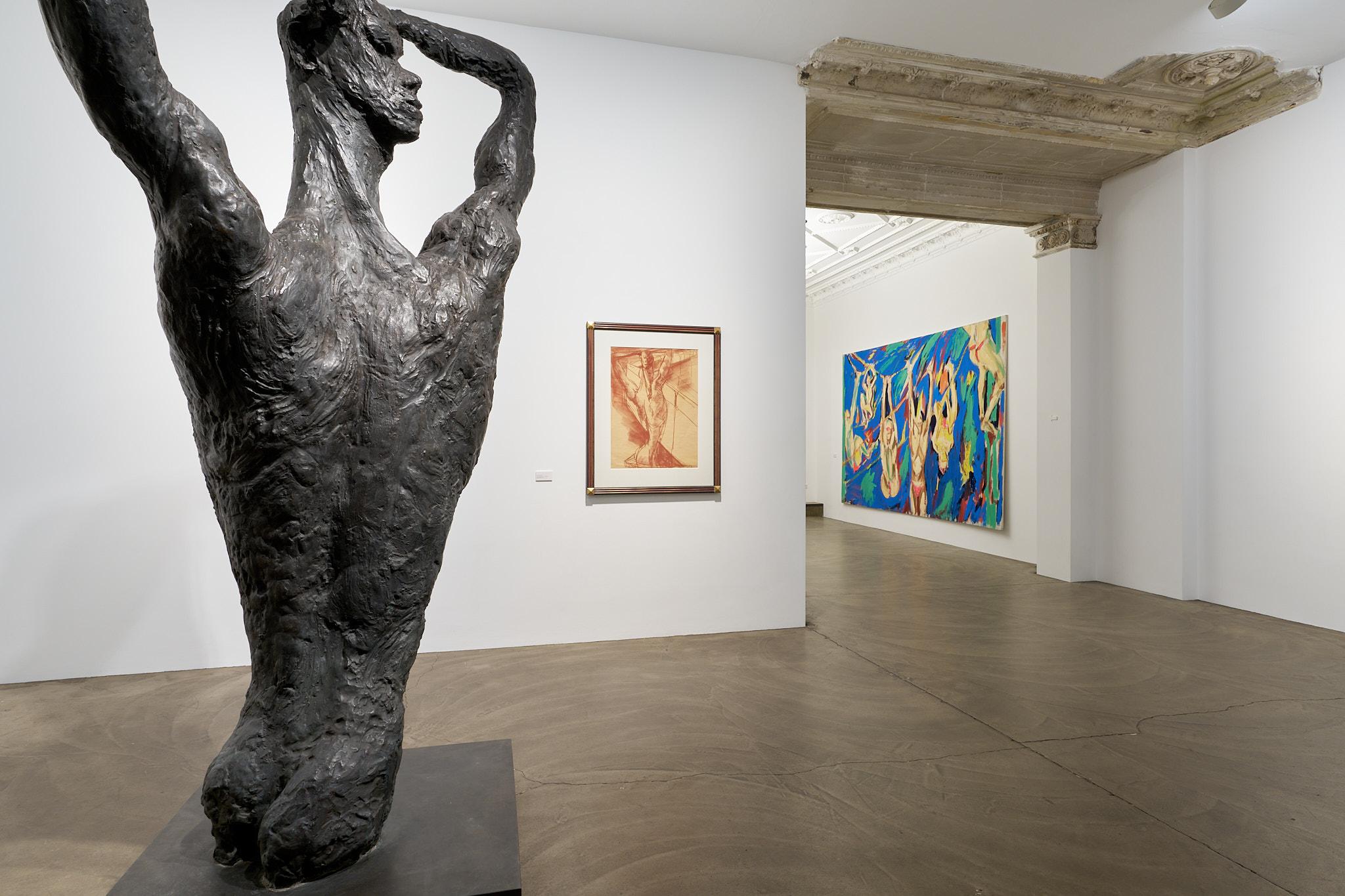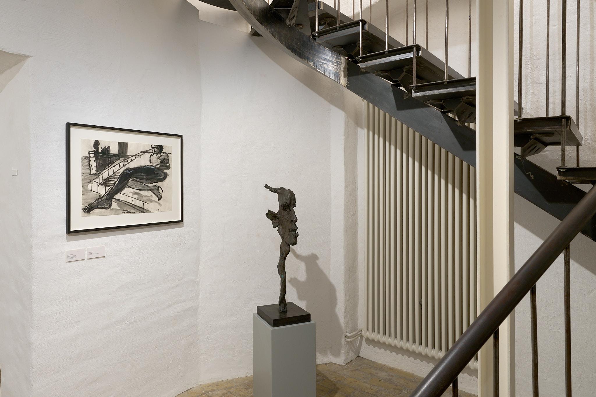 Ein besonderes Highlight der Ausstellung bildet Fettings Skulptur „Die Drehung“von 1987 in Zusammenschau mit seinemausgestellten Gemälde „The Wall“ aus dem gleichen Jahr und einer Rötelzeichnung als Vorstudie sowohl zum Gemälde als auch zur Skulptur. Der expressionistisch übersteigerte, langgestreckte Torso in Körperspirale mit angewinkelten Armen und auf den Kopf gelegten Händen der überlebensgroßen Bronzeskulptur erscheint im Gemälde in Blautönen vor einer gelb gehaltenen Darstellung der Berliner Mauer.Die Zusammenstellung zeigt einerseits die enge Verbindung von Malerei, Zeichnung und Plastik in Fettings Schaffen. Die drei Arbeiten lassen den Körper in unterschiedlichen Dimensionen erfahrbar werden: als farbige Fläche, als Linie, als Bewegung im Raum. Sie verkörpern zugleich den Kern des künstlerischen Ansatzes der „Jungen Wilden“ – das Unmittelbare, das Gestische, das Lebendige. In seiner Darstellung des männlichen Aktes vor der Mauer verweist Fetting aber auch symbolisch auf die Verbindung von Kunst, Körperlichkeit und Zeitgeschichte, auf das West-Berlin der 1980er Jahre als einen Freiraum für künstlerischen Ausdruck und sexuelle Selbstbestimmung im Schatten mentaler und realer Mauern.