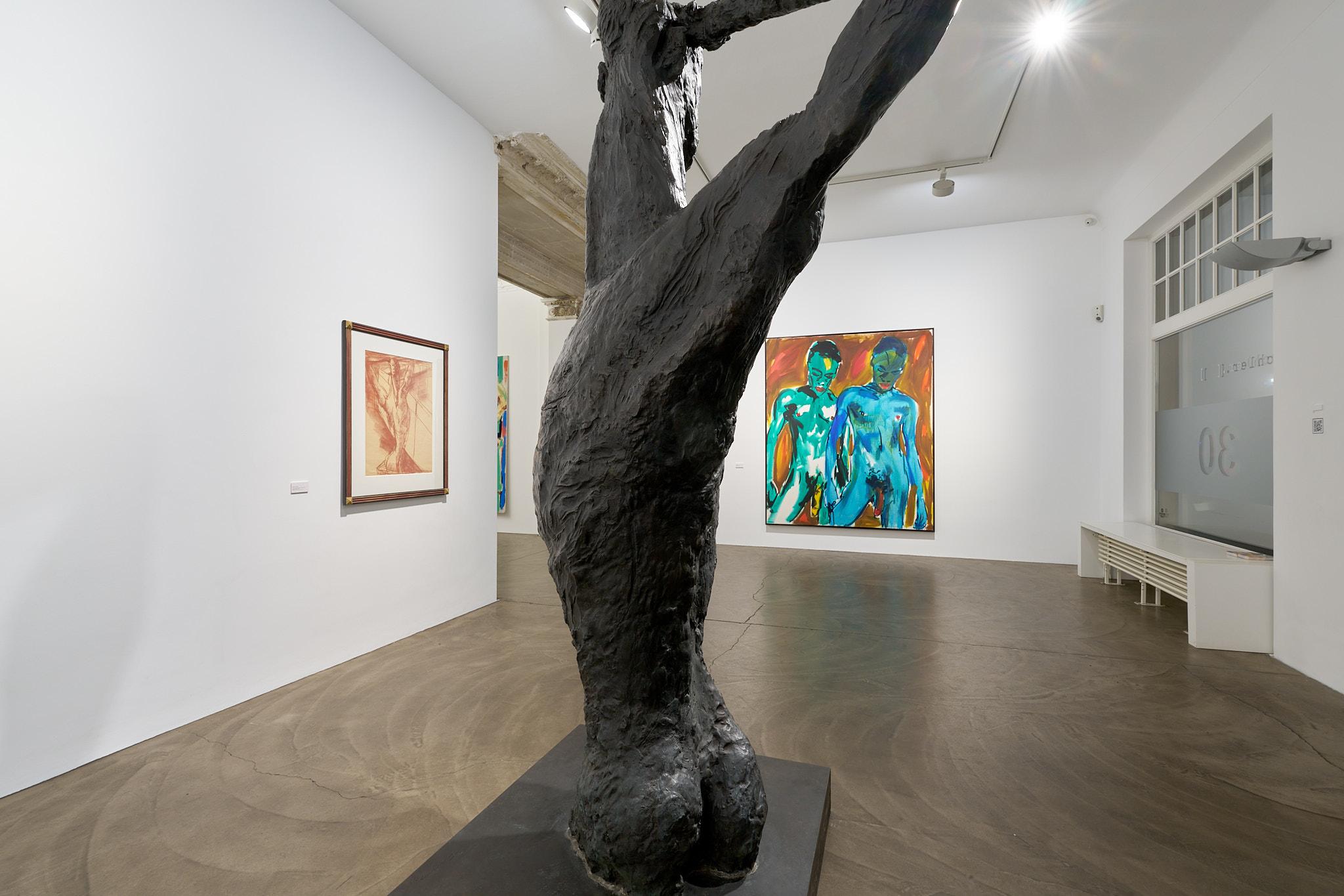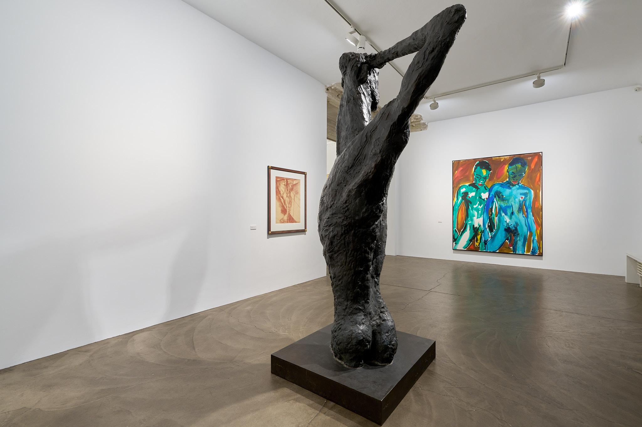A special highlight of the exhibition is Rainer Fetting’s sculpture “Die Drehung” (1987), shown alongside his painting “The Wall” from the same year and a red chalk drawing that served as a preliminary study for both. The expressionistically exaggerated, elongated torso of the life-size bronze, its body twisted in a spiral with bent arms and hands resting on the head, reappears in the painting rendered in blue tones before a yellow depiction of the Berlin Wall. This constellation illustrates the close connection between painting, drawing, and sculpture in Fetting’s work. Together, the three pieces allow the body to be experienced across different dimensions—as color field, as line, as movement in space. They embody the essence of the “Junge Wilde” approach: immediacy, gesture, vitality. In portraying the male nude before the Wall, Fetting also symbolically evokes the link between art, corporeality, and history—West Berlin of the 1980s as a space of artistic expression and sexual self-determination in the shadow of both mental and physical walls.
