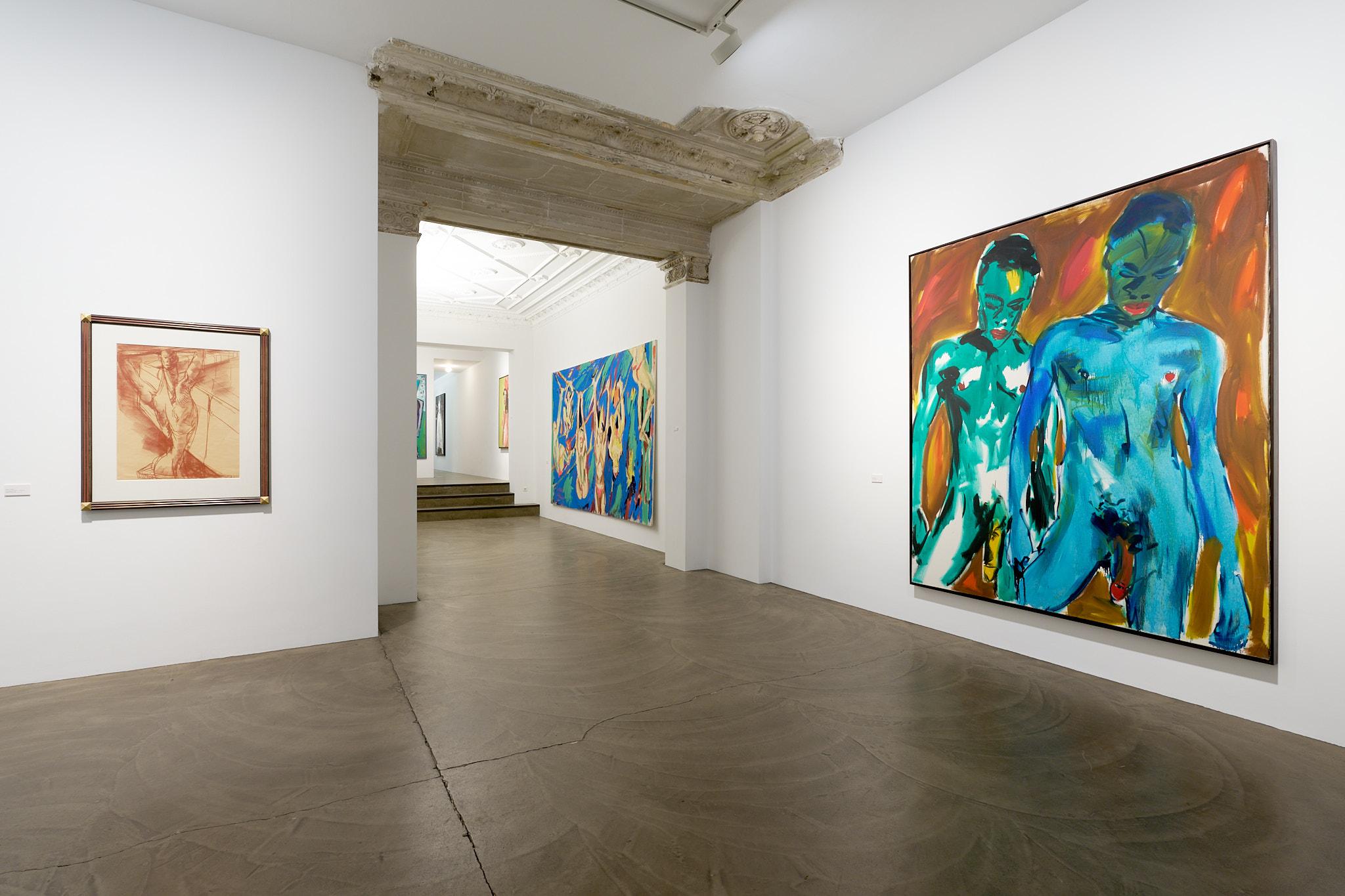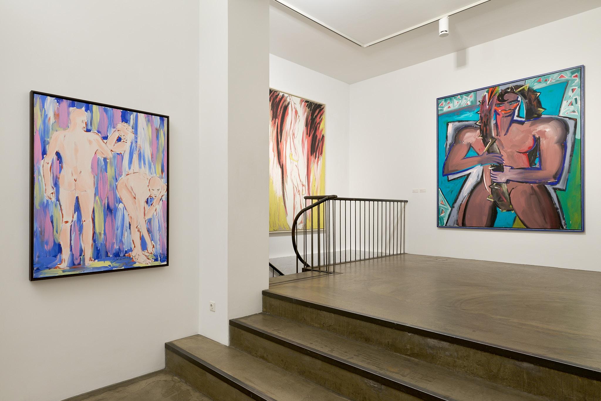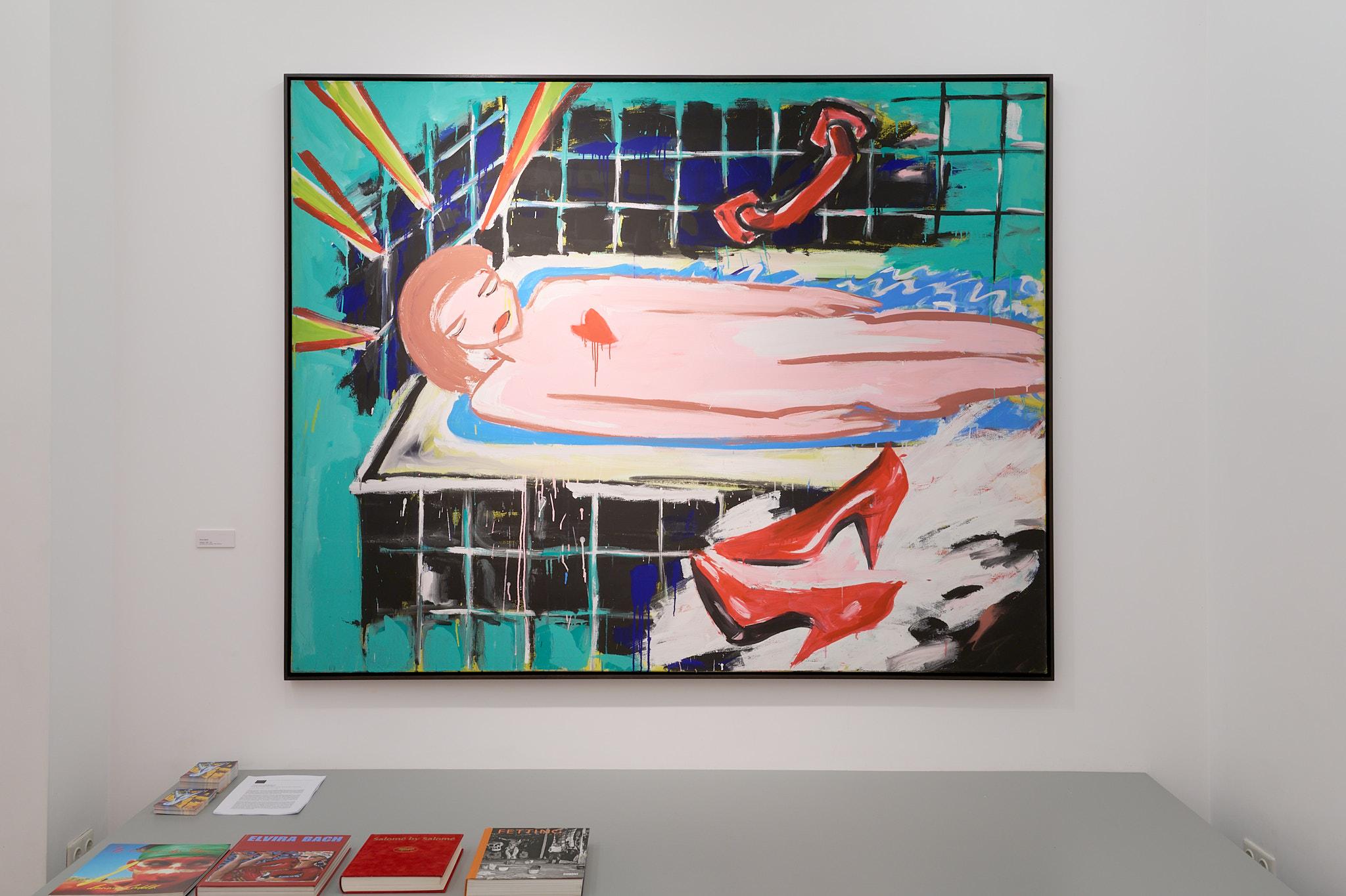 Neben Fetting zeigen Elvira Bach, Luciano Castelli und Salomé jeweils eigenständige, doch verwandte Perspektiven auf das Thema des Aktes. Elvira Bach, die mit ihren charakteristischen Frauenfiguren seit den frühen 1980er-Jahren für Furore sorgte, stellt in ihren Bildern weibliche Selbstbestimmung, weibliches Begehren und Lust und ihre Selbstinszenierung ins Zentrum. Ihre Frauen sind nackt, weil sie es wollen – stark, autonom, sinnlich. Luciano Castelli wiederum untersucht in seinen oft androgynen Selbstakten das Spiel der Geschlechter, die Auflösung von Rollenbildern und die Körperlichkeit des Selbst. Seine Figuren bewegen sich zwischen Verführung und Distanz, zwischen Pose und Bekenntnis. Salomé schließlich bringt die theatralische Geste und die Energie seiner Performances in seine Malerei ein. Seine Akte sind ekstatisch, vibrierend, ein Rausch aus Farbe und Licht. Gemeinsam entfalten diese Positionen ein Bild des Körpers, das ebenso individuell wie universell ist – ein Körper, der spricht, begehrt, sich zeigt und verwandelt.