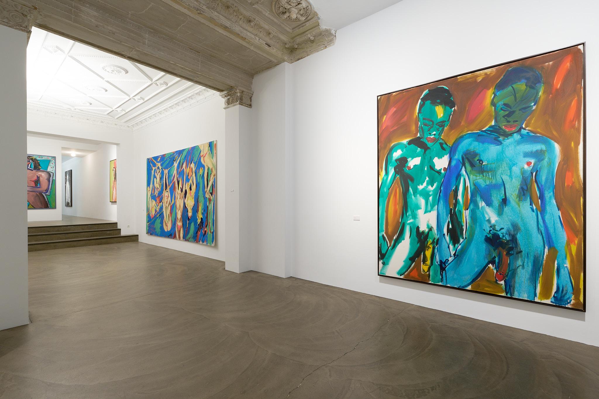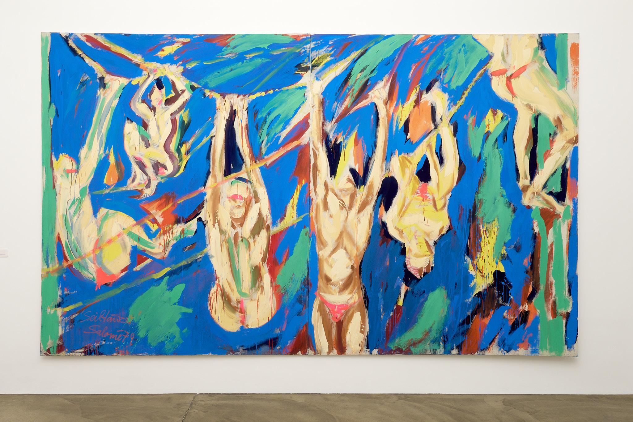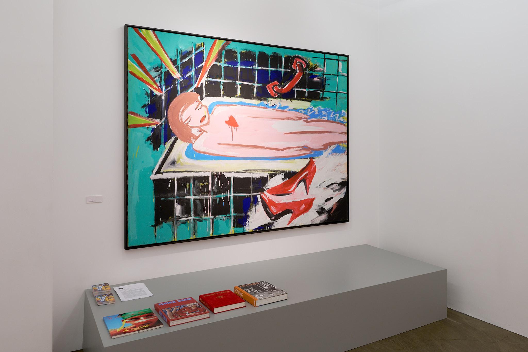 Neben Fetting zeigen Elvira Bach, Luciano Castelli und Salomé jeweils eigenständige, doch verwandte Perspektiven auf das Thema des Aktes. Elvira Bach, die mit ihren charakteristischen Frauenfiguren seit den frühen 1980er-Jahren für Furore sorgte, stellt in ihren Bildern weibliche Selbstbestimmung, weibliches Begehren und Lust und ihre Selbstinszenierung ins Zentrum. Ihre Frauen sind nackt, weil sie es wollen – stark, autonom, sinnlich. Luciano Castelli wiederum untersucht in seinen oft androgynen Selbstakten das Spiel der Geschlechter, die Auflösung von Rollenbildern und die Körperlichkeit des Selbst. Seine Figuren bewegen sich zwischen Verführung und Distanz, zwischen Pose und Bekenntnis. Salomé schließlich bringt die theatralische Geste und die Energie seiner Performances in seine Malerei ein. Seine Akte sind ekstatisch, vibrierend, ein Rausch aus Farbe und Licht. Gemeinsam entfalten diese Positionen ein Bild des Körpers, das ebenso individuell wie universell ist – ein Körper, der spricht, begehrt, sich zeigt und verwandelt.